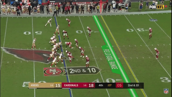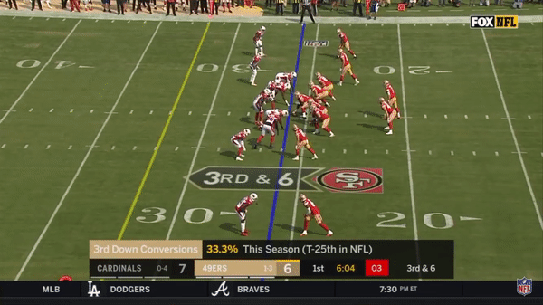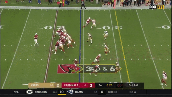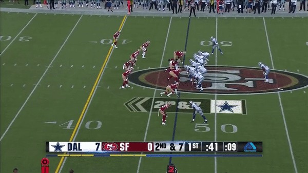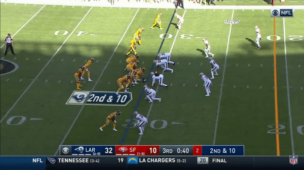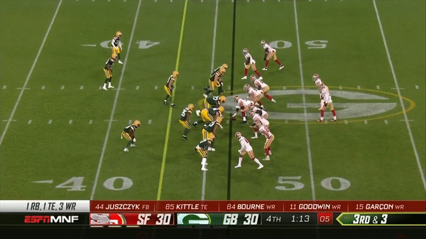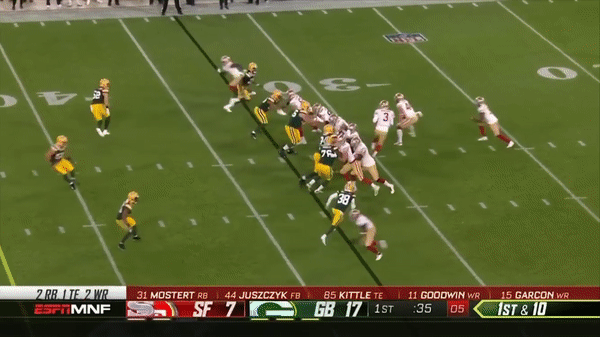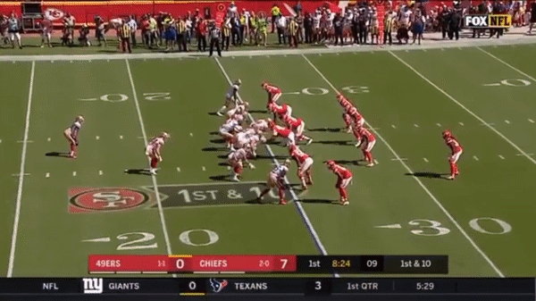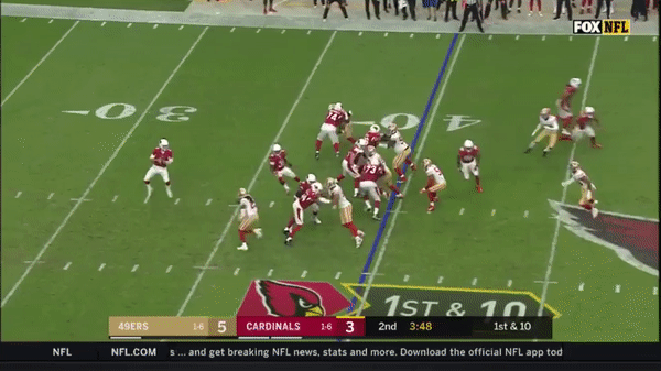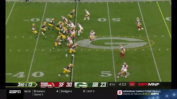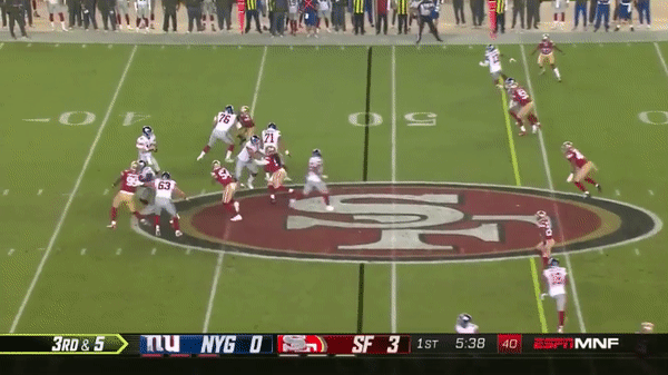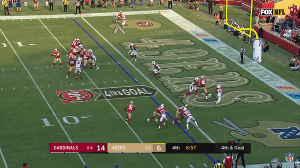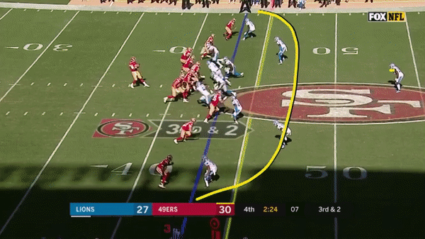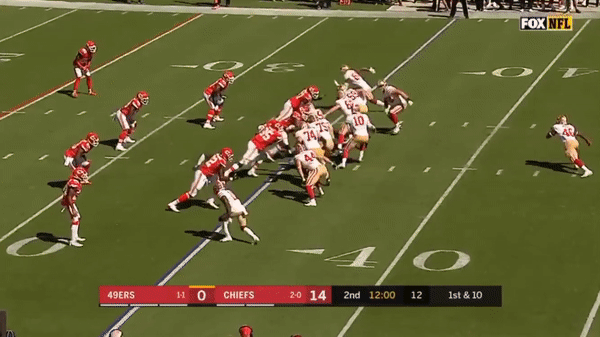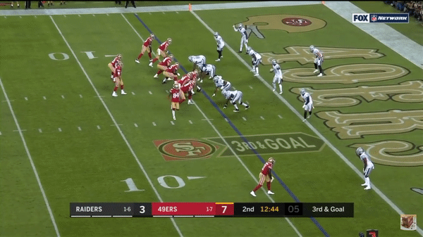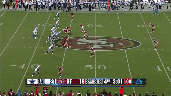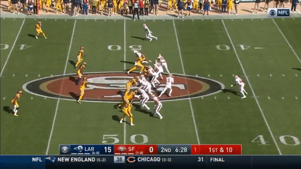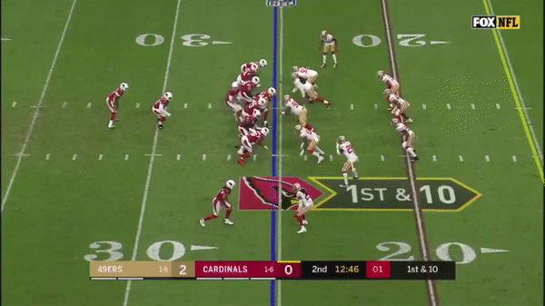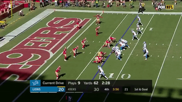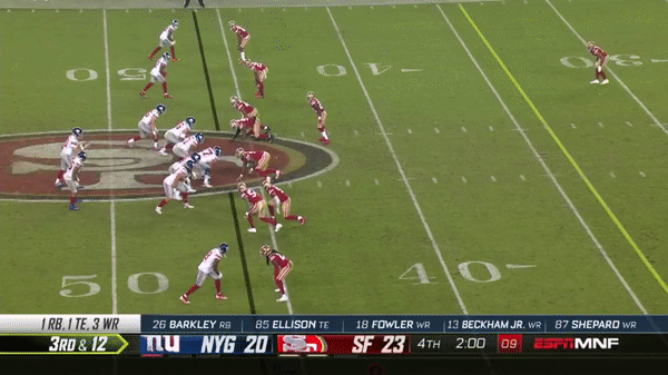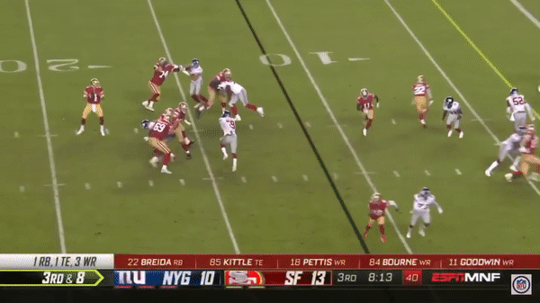 Here was a beautifully schemed up play by Kyle Shanahan that Jimmy makes the pass but Kittle flubs the catch, if Kittle doesn’t drop the pass, with his YAC ability, it could have been a very large gain.