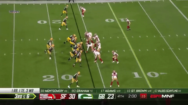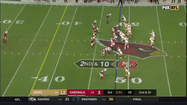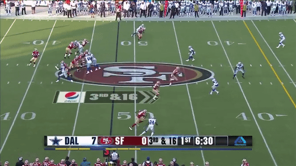 Here Jimmy takes advantage of a busted coverage to drop a beauty into Kyle Juszczyk (#44)