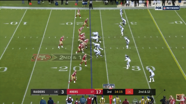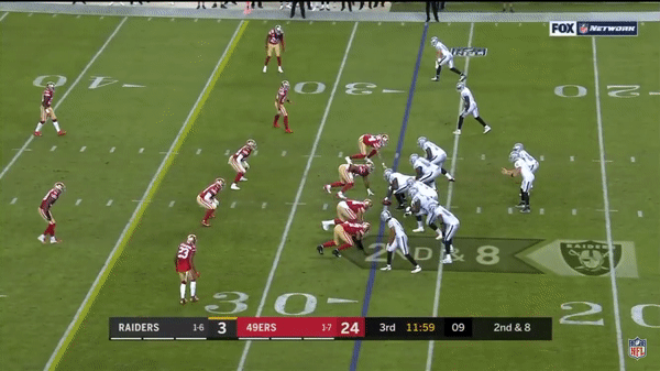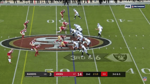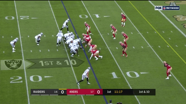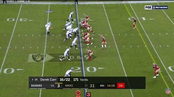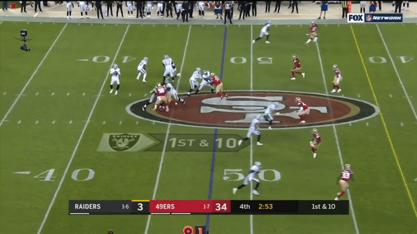 Solomon Thomas chases Raiders QB Derek Carr out of bounds and is credited with a sack.