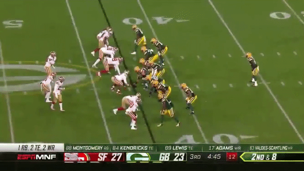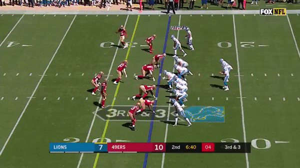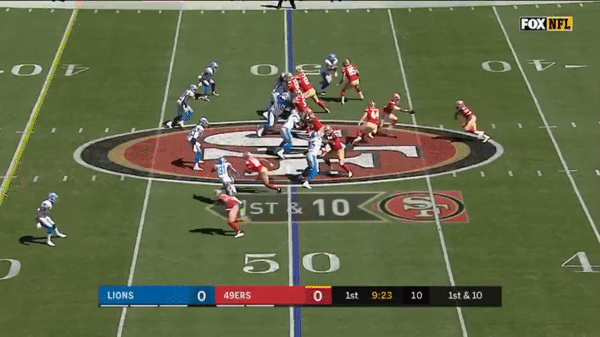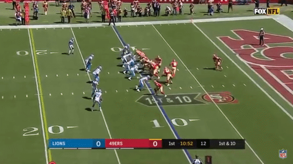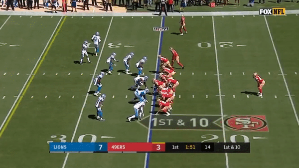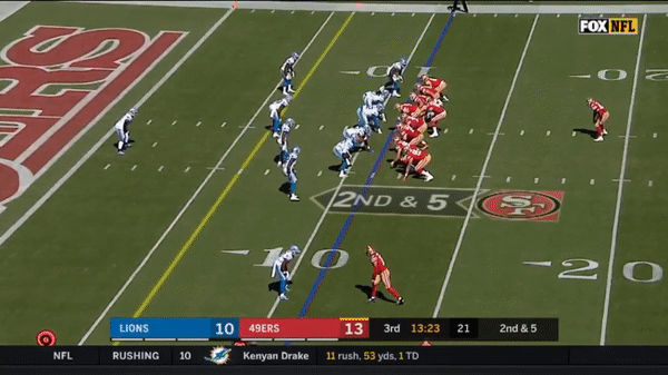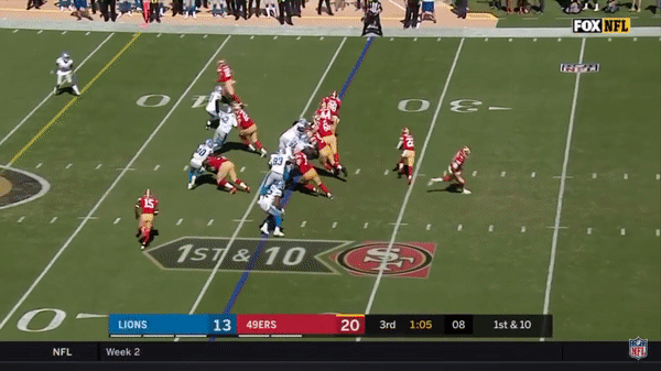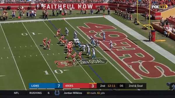 Here’s a play that could have cost the 49ers the game as Jimmy predetermines where he will go with the ball and Tracy Walker breaks on the route and picks it off but there was a holding on Quandree Diggs in the secondary so the interception was called back.