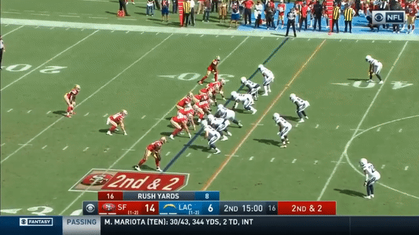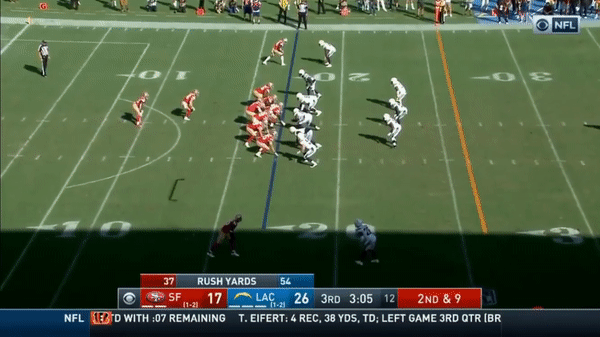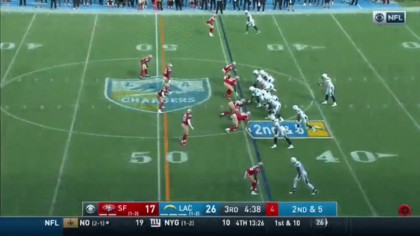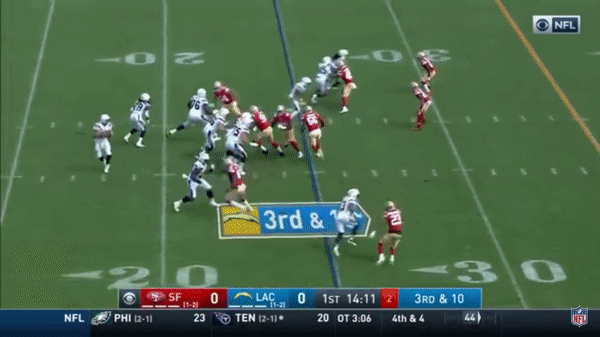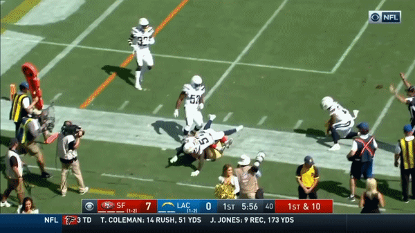 Kittle has a very nice catch and run for a touchdown against the Chargers.